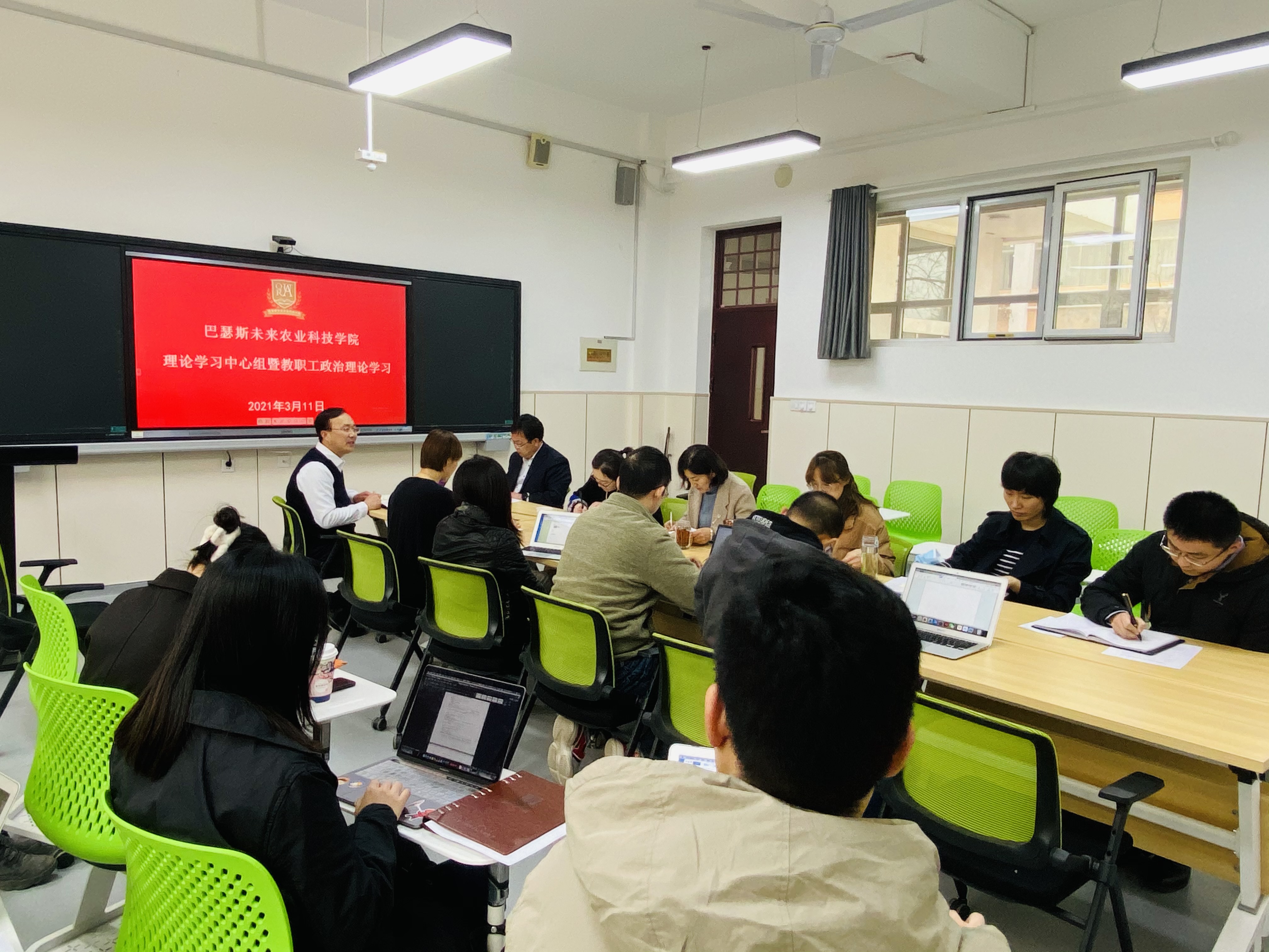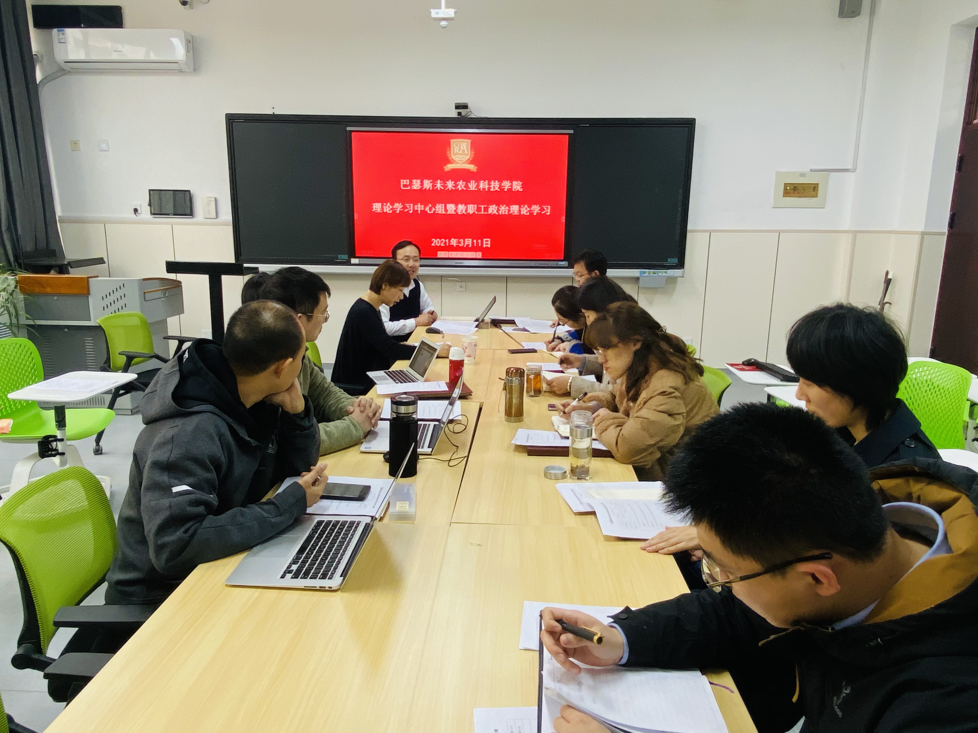 3月11日下午,巴瑟斯未来农业科技学院于教学楼F105开展党总支理论学习中心组暨教职工政治理论学习。会议由学院党总支负责人吕玉亭主持,全体教职工和综合英语教师参加。