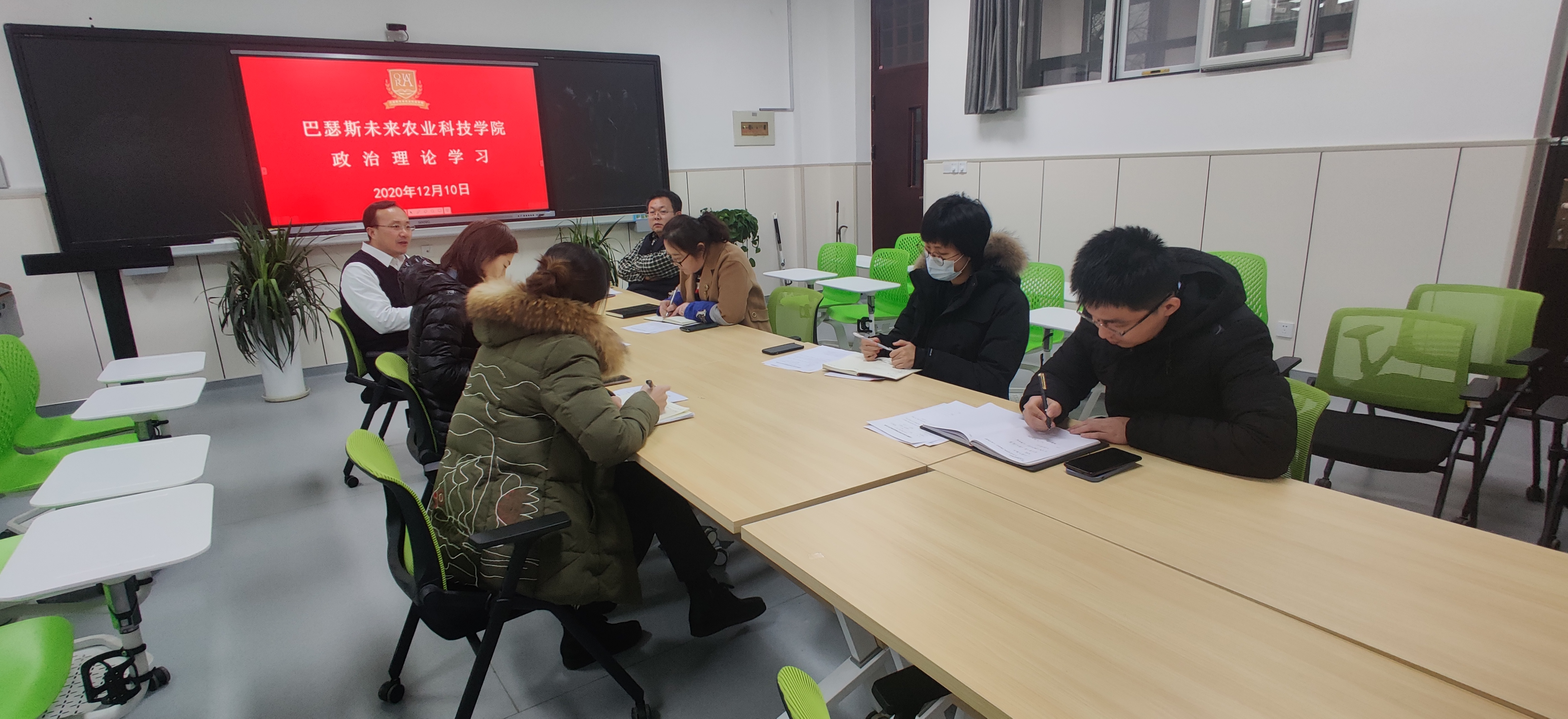 12月10日下午,巴瑟斯未来农业科技学院于教学楼F105开展教职工政治理论学习。会议由党总支负责人吕玉亭主持,全体教职工参加。