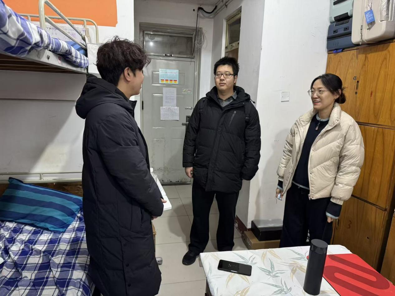 在检查过程中,师生细致排查宿舍用电安全隐患,着重查看大功率电器的使用情况、电路线路是否老化、插排是否规范摆放等。同步检查宿舍的卫生整洁程度、内务整理状况以及基础设施的完好状态。此外,还与学生亲切交流,关切地询问入冬后的生活起居、期末复习进度以及实际需求。