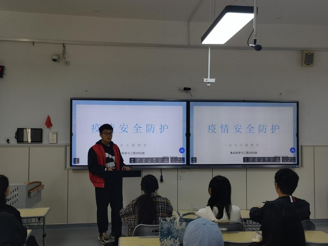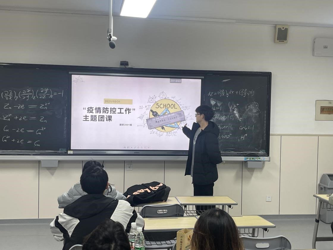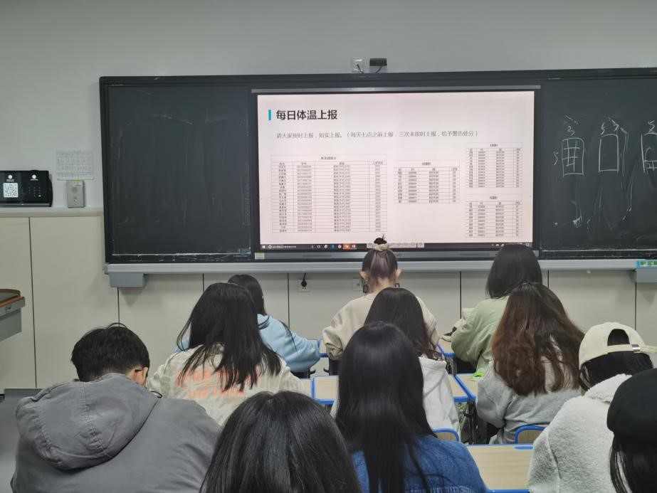 各班负责人就疫情防控相关知识对班级学生进行培训,通报实时疫情情况,旨在使全体同学从思想上绷紧疫情防控的弦,从而建立起疫情防控的城墙。同时,各班制定了符合班级情况的疫情防控制度,比如班委分管宿舍制度、每天定时消杀制度、通风检查制度等,同时要求舍长做好监督提醒,每天实时关注宿舍同学的健康情况,每天按时进行体温上报。