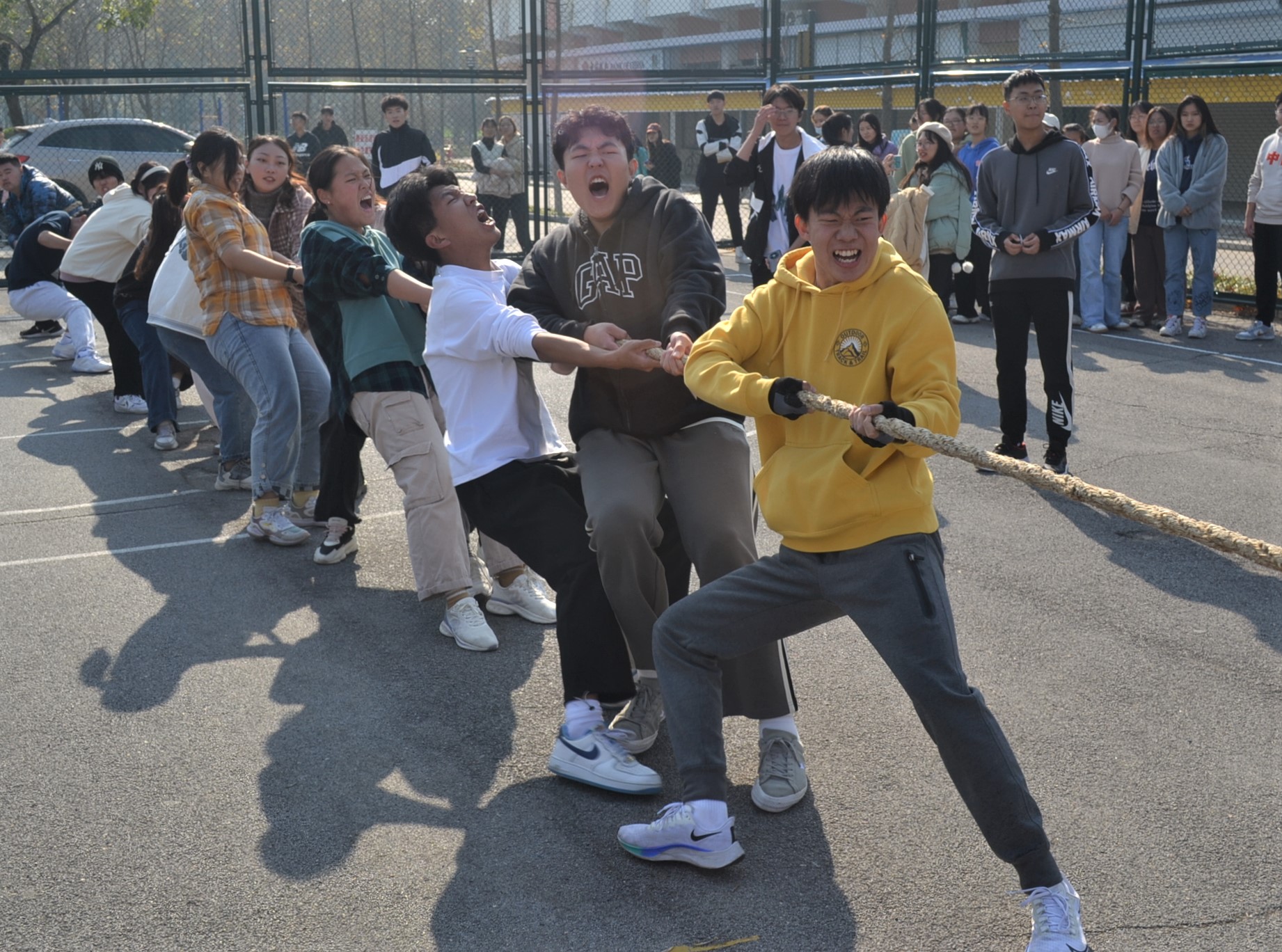 学院一年一度的拔河比赛秉承“友谊第一、比赛第二”的原则,以两个班级联合组队的形式展开力量和气势对决。比赛过程中,观赛的同学们都既紧张又兴奋地看着精神抖擞、摩拳擦掌的选手们充满火药味的对峙。随着裁判的哨声响起,选手们站成“弓”定步,身体统一后倾,响亮地喊着“一二、一二”的口号一次次地发力向后拉,观赛的同学们也不甘落后,不断喊着“加油”为己方战队热场助威。在几分钟的僵持后最终决出胜负,胜方选手激动地呐喊击掌,败方战队虽面露遗憾,但依然互相打气,为下一次的比赛加油鼓劲。整场比赛场上选手们汇集众力、勇战劲敌,场下同学们心潮澎湃、高声应援,比赛气氛热烈,洋溢着青春活力。