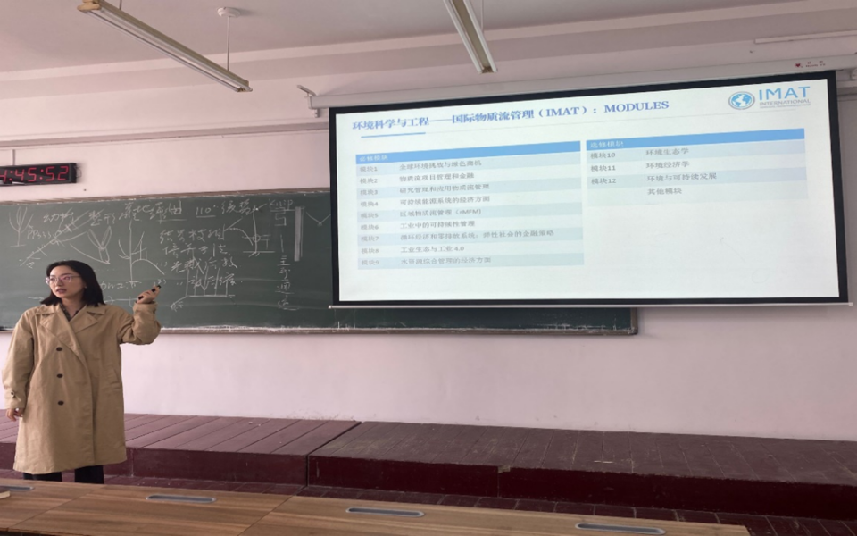 曲玲围绕烟台大学中外合作办学项目展开介绍,从合作院校资源、师资力量、国际物质流管理硕士专业的招生计划、申请条件、入学考核及职业前景等方面进行详细说明。她以智慧经济园区低碳减排技术为例,讲解了项目在清洁能源利用、节能减排应用等领域的创新亮点与预期成果,帮助学生全面了解项目优势。