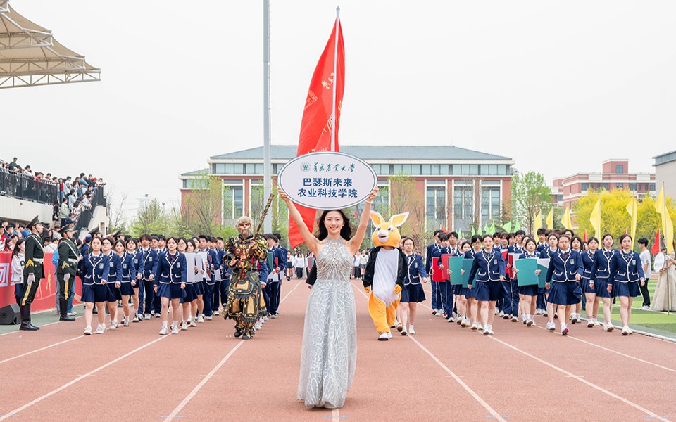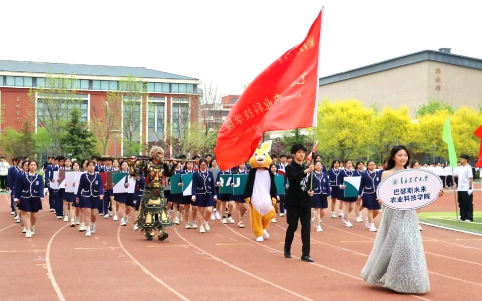 17日上午,运动会正式拉开帷幕,学院方队在仪仗队的带领下,伴随着激昂的进行曲,迈着整齐的步伐向着主席台迈进;方队行进到主席台前,举牌组成心形图案,象征青岛农业大学和英国皇家农业大学跨越山海的情谊;手牌翻转是升学院校的校徽,展现巴瑟斯学院第一届毕业生取得的优异成绩;队伍前方,彼得兔和黑神话悟空人偶形象代表中外文化融合交流;方队学生高喊“中外携手,共创一流,奋进巴院,勇立潮头”的口号,彰显巴瑟斯学院学子牢记中外合作交流的担当。