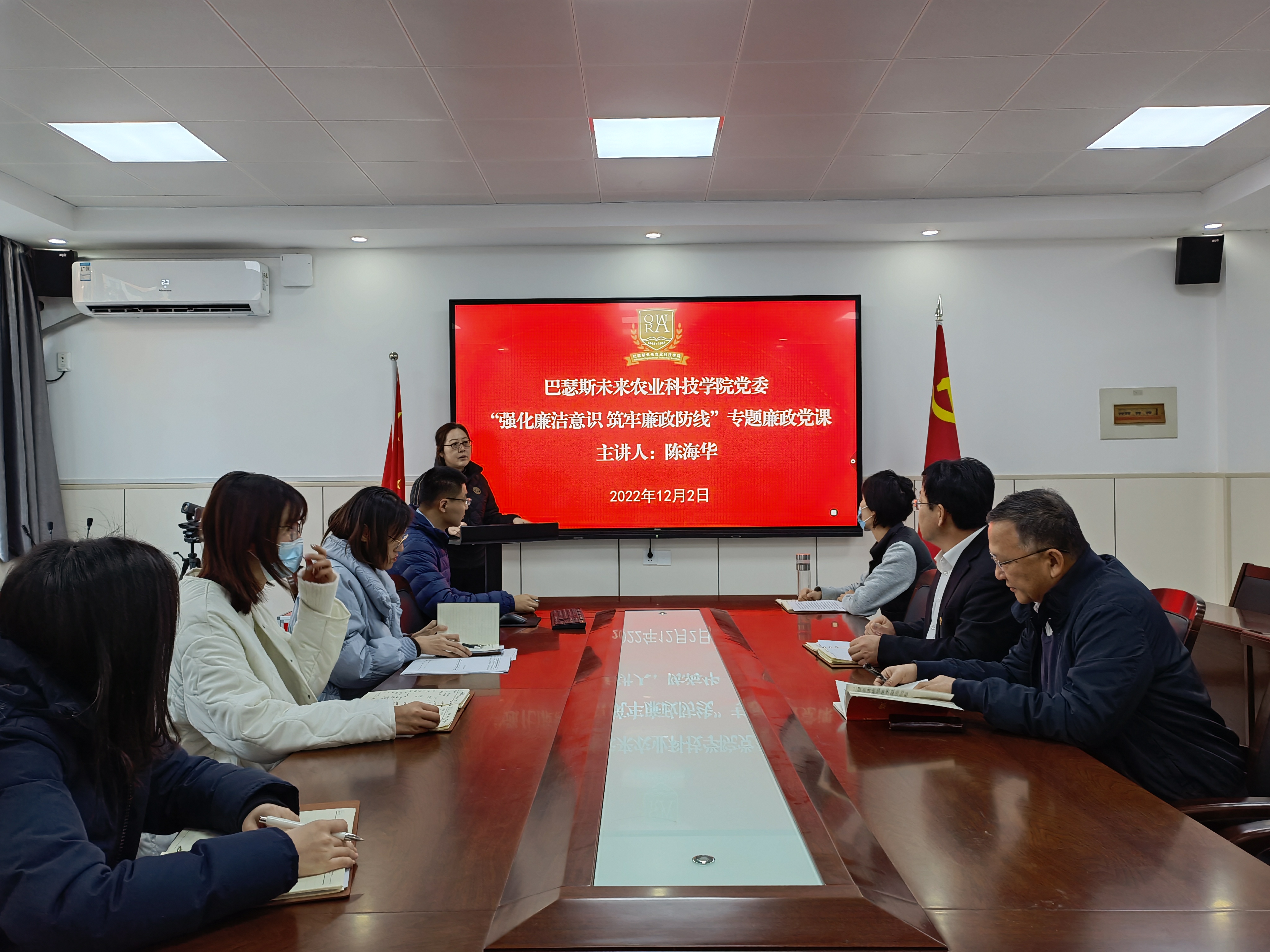12月2日,巴瑟斯未来农业科技学院副院长陈海华为学院教职工讲授“强化廉洁意识 筑牢廉政防线”专题党课,党课由学院党委书记刘焕奇主持,全体教职工参加。