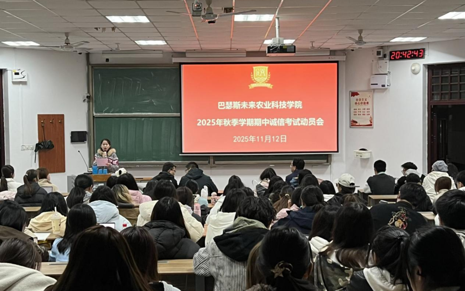 11月12日,青岛农业大学巴瑟斯未来农业科技学院在教学楼B103召开2025年秋季学期期中诚信考试动员大会。会议由辅导员葛得铭主持,院长刘焕奇出席并发表讲话,英国皇家农业大学中国中心驻校专员李迎、学院全体辅导员以及全体学生参会。