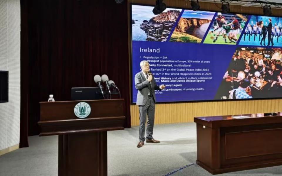 Gerard Looby围绕学生关心的硕士项目政策、申请条件、专业设置、办学优势、国际学生支持以及学业指导等内容进行了详细介绍。他提到,都柏林大学是历史底蕴深厚、科研实力雄厚的研究型大学,农业科学学科实力突出,在爱尔兰、欧洲及全球均位列前茅。他表示,学生可以聚焦农业技术、食品开发、供应链管理等专业方向深耕,系统提升行业应用技能,深化专业认知,同时将有机会对接农业创新、生物加工等领域的国际知名企业,获得广阔就业平台,助力成长为具备国际化视野、通晓国际规则的创新创业型人才。