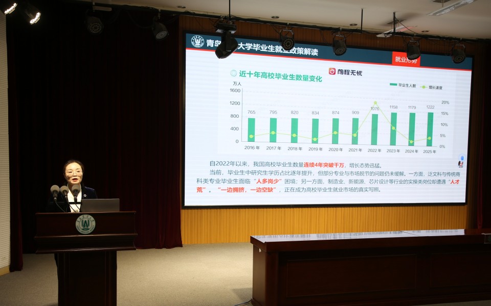 吕国莹以“毕业生就业政策解读”为题,紧密结合当前就业市场趋势,围绕学院不同专业实际情况,从国内考研、出国留学、求职就业等方面,对当前的多元就业形势进行了细致深入地剖析。她结合往届毕业生的典型案例,对毕业生提出对策建议,提醒大家主动把握就业市场动态、清醒认识当前就业形势,明确个人发展目标,持续提升求职核心技能,以积极主动的心态迎接就业挑战、把握就业机遇。