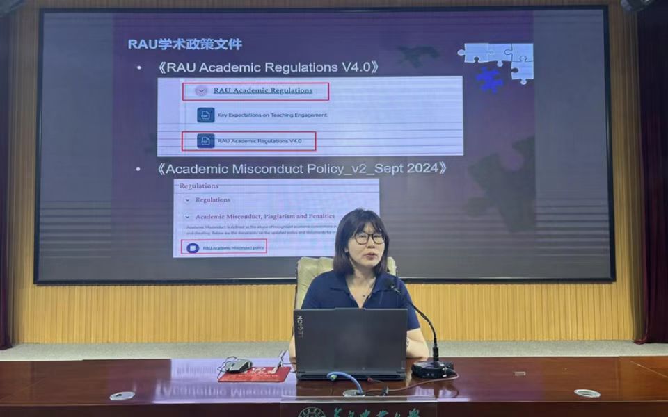 李迎结合英国皇家农业大学学术政策文件,解读了RAU学术规范、学术不端处理办法,同时说明入学注册、资格审核及出勤要求等关键事项。她提醒新生需以高标准要求自己,杜绝学术不端行为,确保达到RAU学业标准。