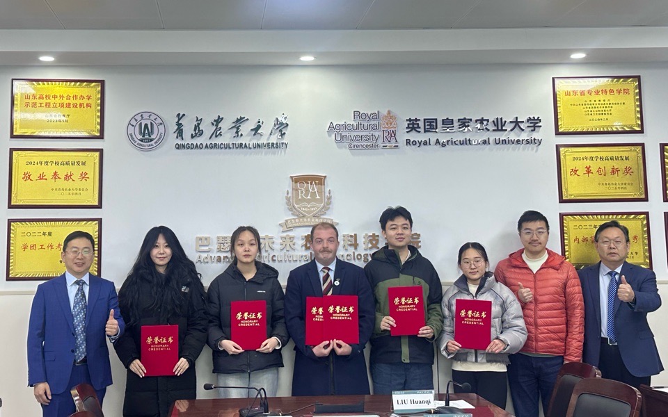 3月18日,英国皇家农业大学2026年度师生学术颁奖典礼以线上线下相结合的方式隆重举行。主会场设于英国皇家农业大学本部,青岛农业大学与山东农业大学校区同步线上接入。巴瑟斯未来农业科技学院党委书记王光炬、院长刘焕奇、英国皇家农业大学中国项目负责人Andy Jin及获奖师生提名者在青岛校区现场共同见证这一荣耀时刻。